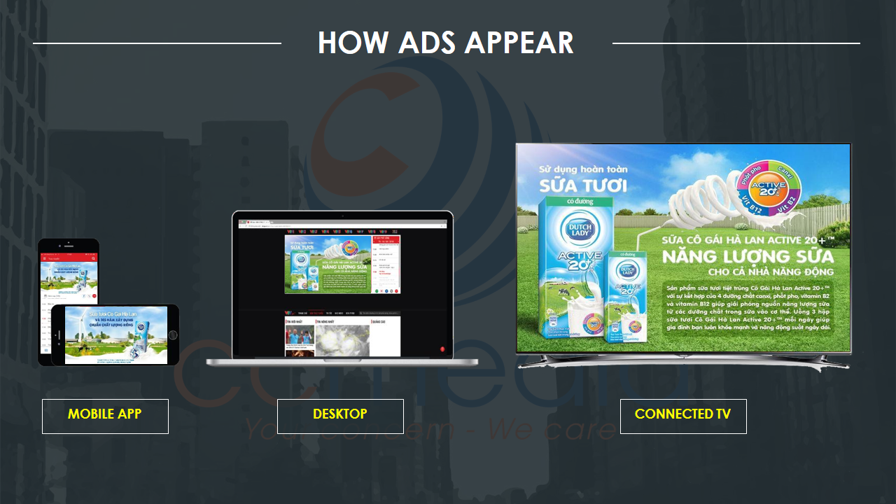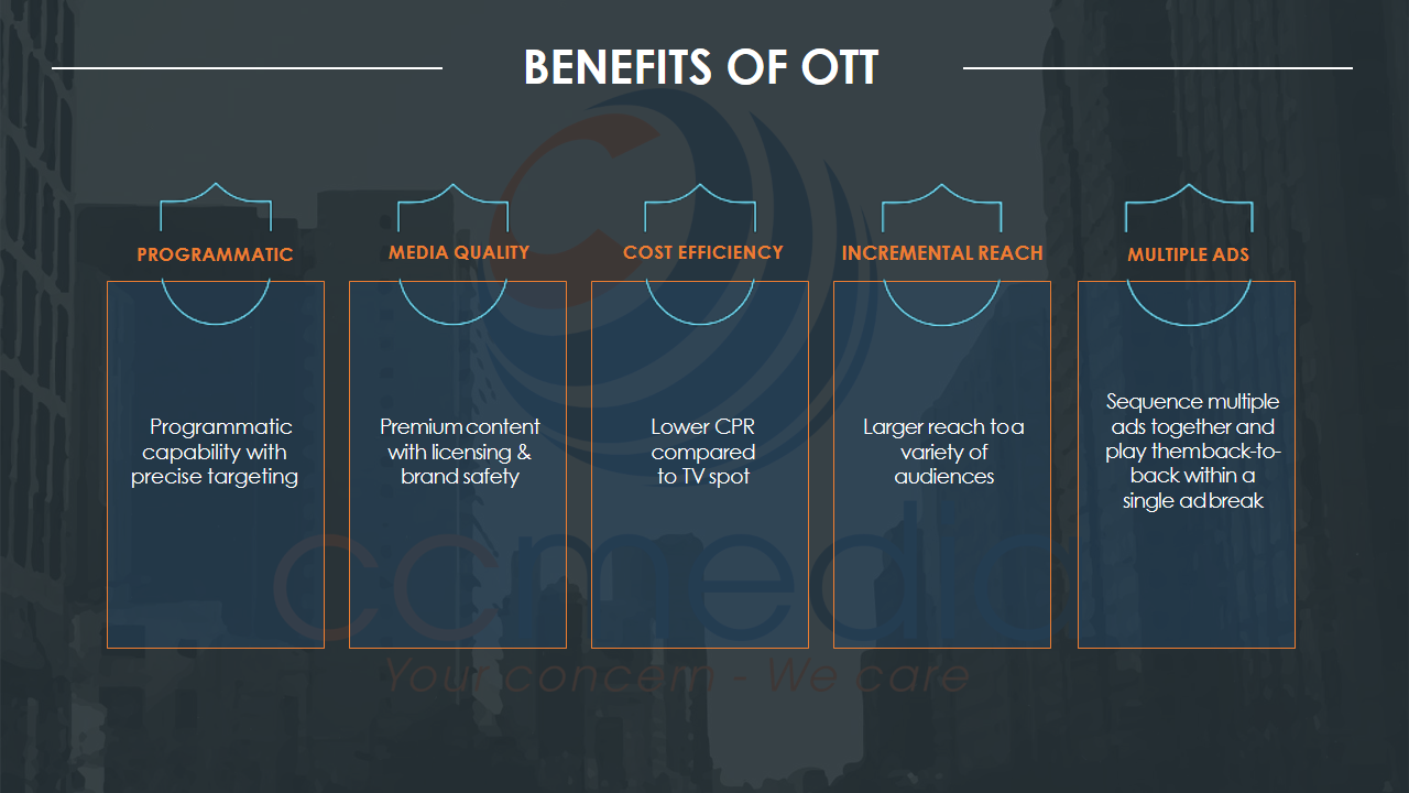 Xã hội ngày càng phát triển, nhất là về lĩnh vực công nghệ. Bởi các thiết bị như Điện thoại thông minh, máy tính bảng, đặc biệt là SmartTV đang ngày càng thịnh hành và được nhiều cá nhân, gia đình sử dụng. Theo đó, thói quen xem truyền hình sẽ dần dần chuyển đổi từ thói quen xem truyền hình truyền thống sang thói quen xem truyền hình trên nền tảng Internet thông qua các ứng dụng như VTVGo, VTVCab On, VTVGiaitri… CCMedia chính thức đưa ra giải pháp quảng cáo OTT vào thị trường truyền thông, hướng tới một hình thức truyền thông thông minh, diện rộng và đa dạng đối tượng.